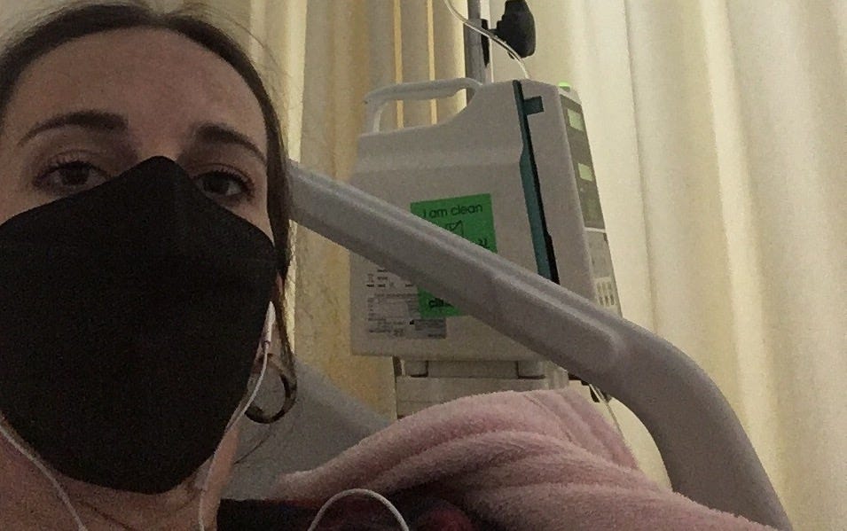 When I arrived at the hospital for my treatment, I was nauseous from the ride and still had this weeklong headache. I was feeling quite badly. I went to the cafe hoping for a minute of my own and a banana. They didn’t sell any fruit. I resigned and went to the treatment area to check in. Once I got my bed, I was really feeling terrible. I was overstimulated by the bright lights, annoyed at the guy in the next bed who wouldn’t stop talking on the phone, feeling dirty from the taxi, so tired because I slept poorly, just not really wanting to be there, and still carrying other stress. I was desperate for a dark cave to reset. I pulled the covers over my head.